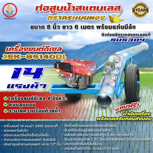 ท่อสูบน้ำสแตนเลสตรากระเบนทอง ขนาด 8 นิ้ว ยาว 6 เมตร พร้อมแท่นมีล้อ พร้อมเครื่องยนต์ดีเซล ( สำหรับงานครุภัณฑ์หลวง ) รุ่น JSK-86140DI เครื่องยนต์ 14 แรงม้า