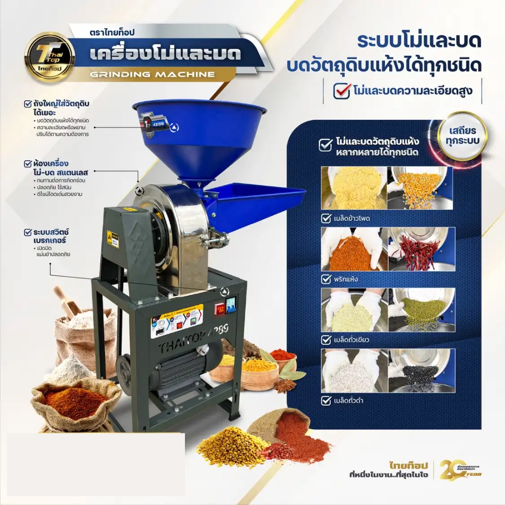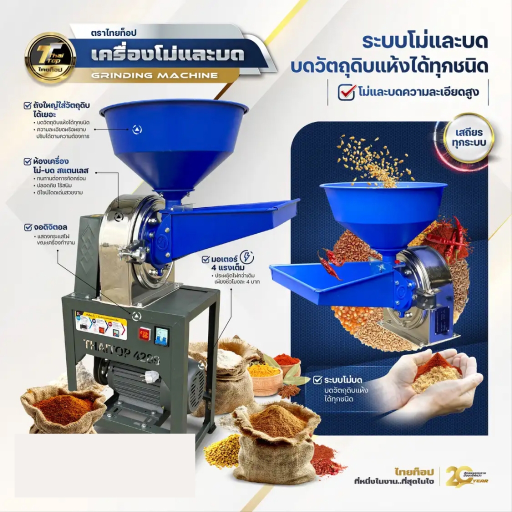 Thai Top เครื่องโม่และบด ไทยท็อป มอเตอร์ 4 แรง บดวัตถุดิบแห้งได้ทุกชนิด โม่และบดความละเอียดสูง