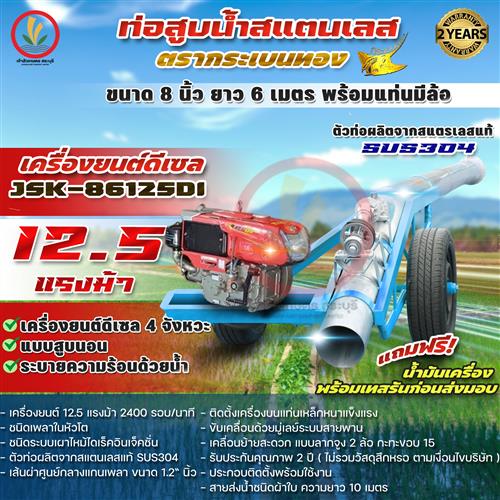 ท่อสูบน้ำสแตนเลสตรากระเบนทอง ขนาด 8 นิ้ว ยาว 6 เมตร พร้อมแท่นมีล้อ พร้อมเครื่องยนต์ดีเซล ( สำหรับงานครุภัณฑ์หลวง ) รุ่น JSK-86125DI เครื่องยนต์ 12.5 แรงม้า