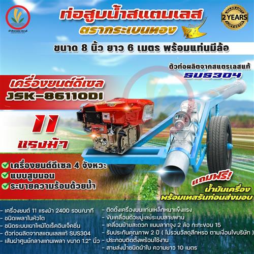 ท่อสูบน้ำสแตนเลสตรากระเบนทอง ขนาด 8 นิ้ว ยาว 6 เมตร พร้อมแท่นมีล้อ พร้อมเครื่องยนต์ดีเซล ( สำหรับงานครุภัณฑ์หลวง ) รุ่น JSK-86110DI เครื่องยนต์ 11 แรงม้า