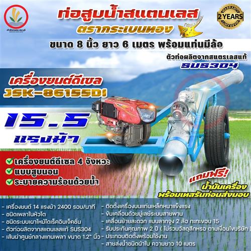 ท่อสูบน้ำสแตนเลสตรากระเบนทอง ขนาด 8 นิ้ว ยาว 6 เมตร พร้อมแท่นมีล้อ พร้อมเครื่องยนต์ดีเซล ( สำหรับงานครุภัณฑ์หลวง ) รุ่น JSK-86155DI เครื่องยนต์ 15.5 แรงม้า