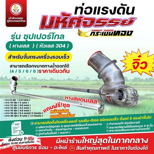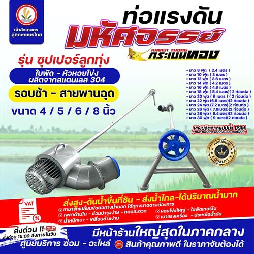 ท่อแรงดัน มหัศจรรย์ ตรากระเบนทอง รุ่น ซุปเปอร์ลูกทุ่ง (รอบช้า - สายพานฉุด) (ปากฟ้า) ใบพัด - หัวหอยโข่ง ผลิตจากสแตนเลส 304 ท่อแรงดันสูง ท่อสูบน้ำ