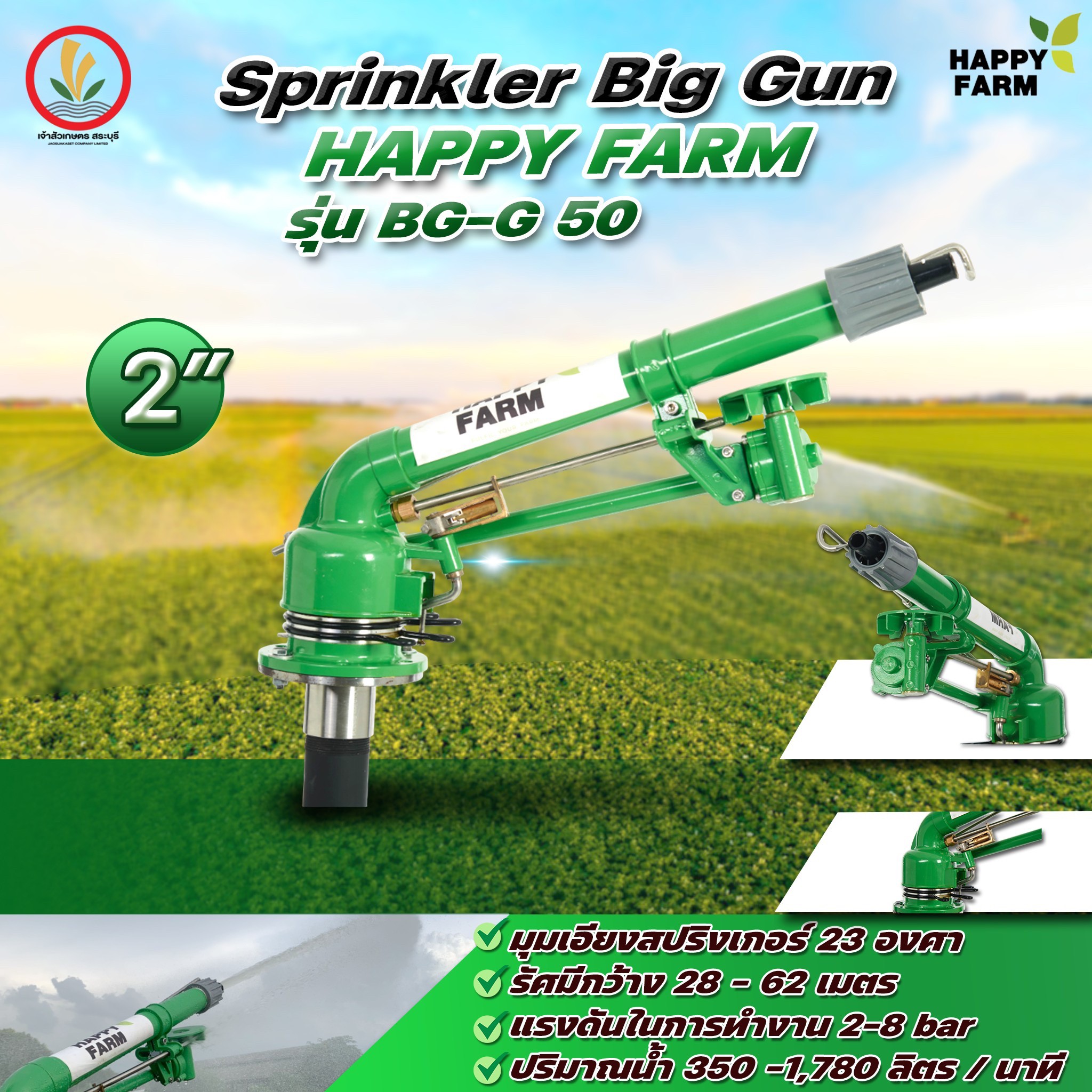 ✅ ขนาด 2 นิ้ว BG-G 50 มุมเอียงสปริงเกอร์ 23 องศา รัศมีกว้าง 28 - 62 เมตร แรงดันในการทำงาน 2-8 bar ปริมาณน้ำ 350 -1,780 ลิตร / นาที
